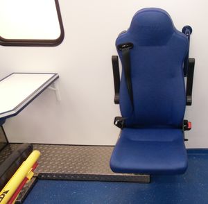 Ergonomic placement of the work equipment and materials such that they can be reached from the seats, in order to avoid the ambulance personnel standing unrestrained during travel