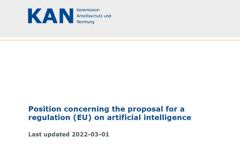 It is in KAN’s interests for the regulation to set out suitable and coherent legal requirements and give rise to corresponding standardization mandates. Standards are to be used as a tool for identifying and reducing risks. As the voice of the German occupational safety and health lobby, KAN published its position paper on the proposal for an EU regulation on artificial intelligence on 1 March 2022. This paper is the result of two exploratory discussions between the German Federal Government, the regional governments, the social partners and the accident insurance institutions.