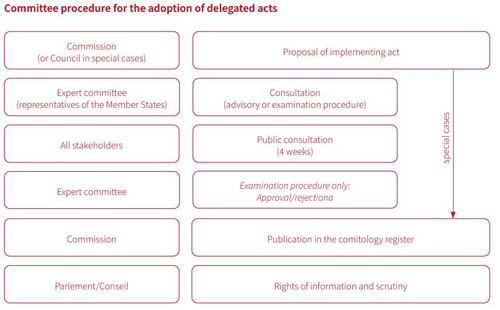 The Better Regulation (guidelines and toolbox) agenda also granted citizens and stakeholders four weeks in which they can submit comments before the committee rules on the implementing act. The committee’s discussions are summarized and published in the comitology register. Whereas the European Parliament and the Council must expressly consent to delegated acts (see below), they possess only rights of information and scrutiny when implementing acts are adopted. The right of scrutiny makes provision for the Parliament and/or the Council to reject an implementing act should it exceed the powers conferred by the initial act. Explicit consent is not required.