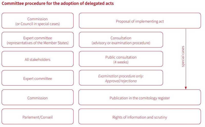 Pursuant to Article 291 of the Treaty on the Functioning of the European Union, general rules and principles concerning mechanisms for control by Member States of the Commission’s exercise of implementing powers are set out in the initial legislative act by the European Parliament and the Council. This is supplemented by Regulation (EU) No. 182/2011 on committee proceedings.